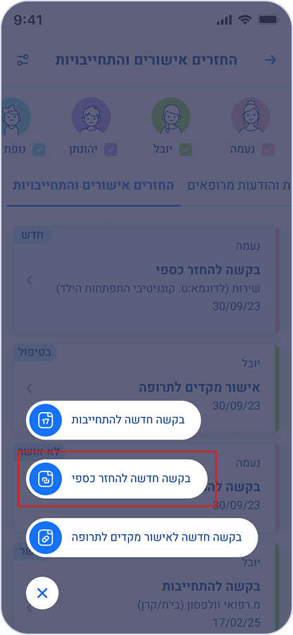 1. בחרו את הנושא המתאים מתוך רשימת ההחזרים האפשרית
