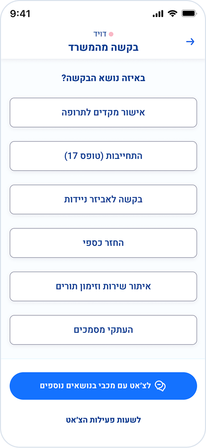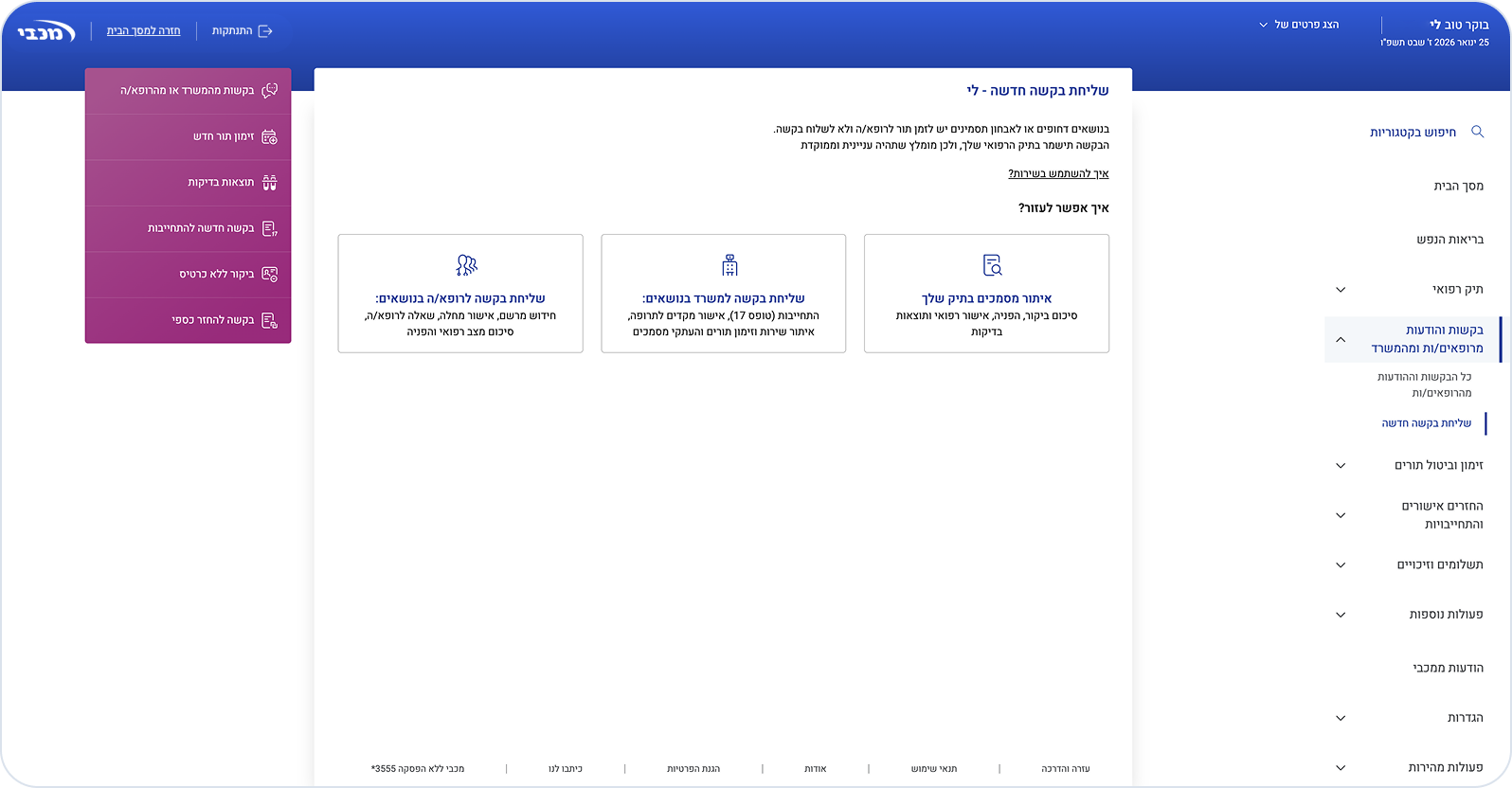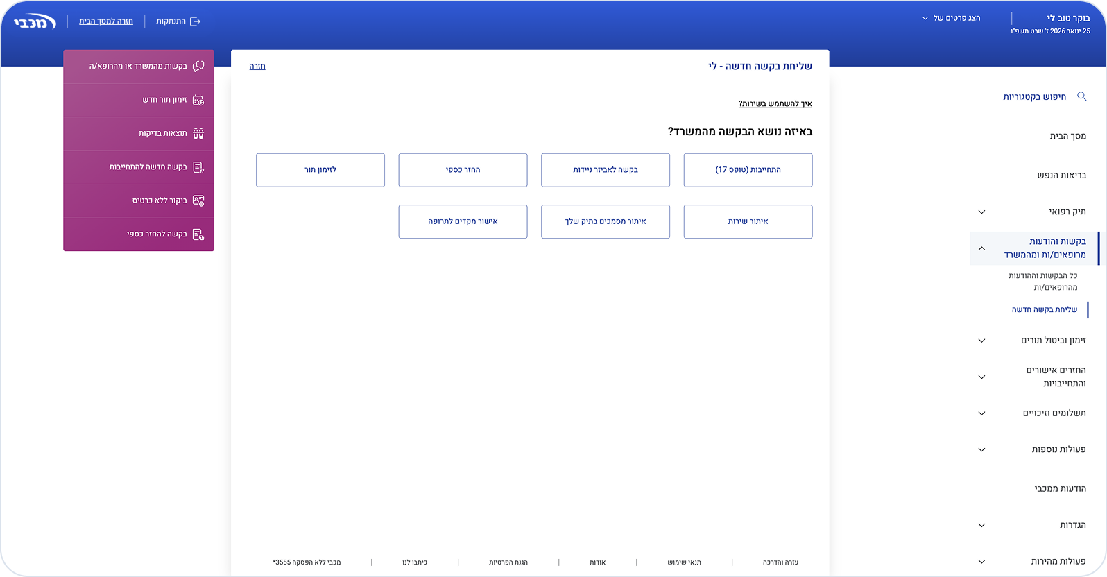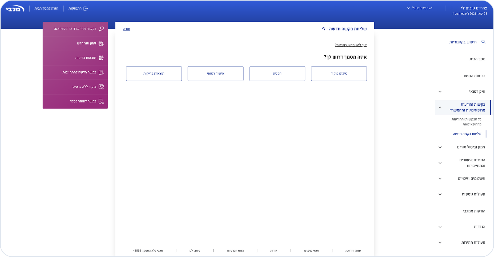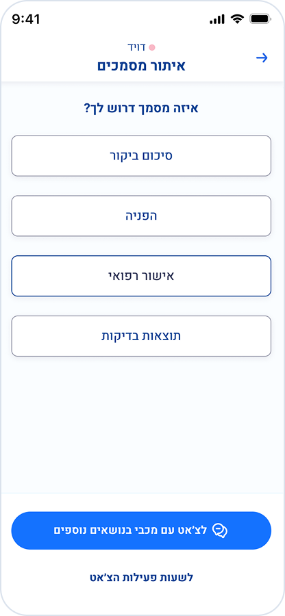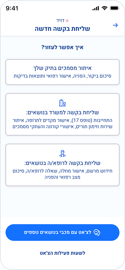 בחרו את סוג הבקשה: איתור מסמכים בתיק שלך, שליחת בקשה למשרד, שליחת בקשה לרופא/ה.