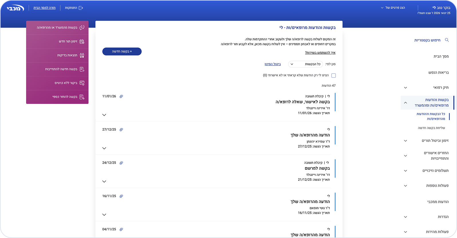 כדי לצפות בבקשות והודעות מרופאים, היכנסו לעמוד הבית ולחצו על "בקשות והודעות מרופאים/ות ומהמשרד" בתפריט מצד ימין > "כל הבקשות וההודעות מהרופאים/ות"