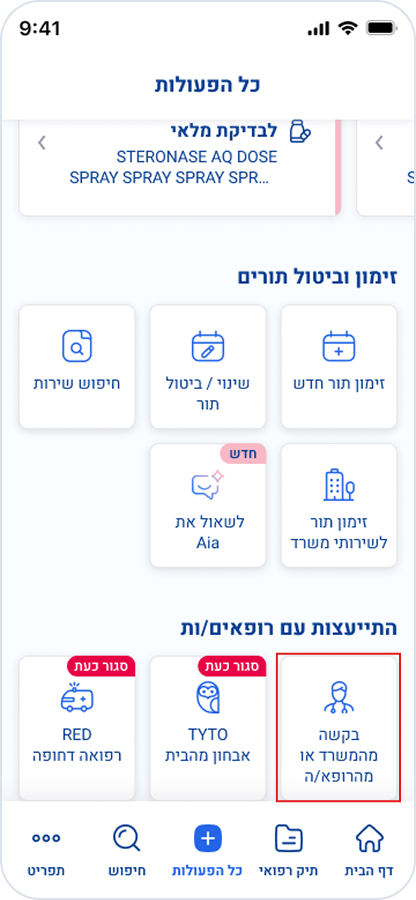 או לחצו על "כל הפעולות" > "בקשה מהמשרד או מהרופא/ה":
