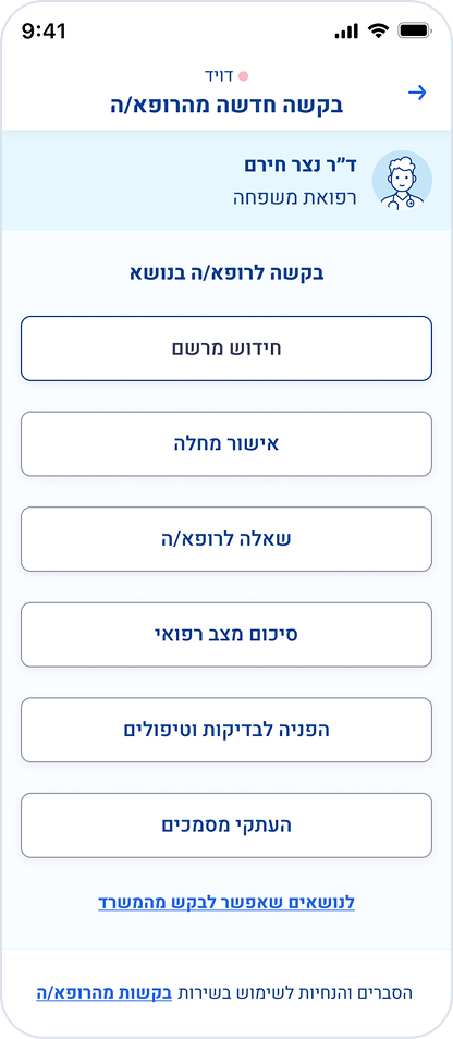 בחרו את הרופא שאליו תרצו לפנות, ולאחר מכן בחרו את נושא הבקשה: