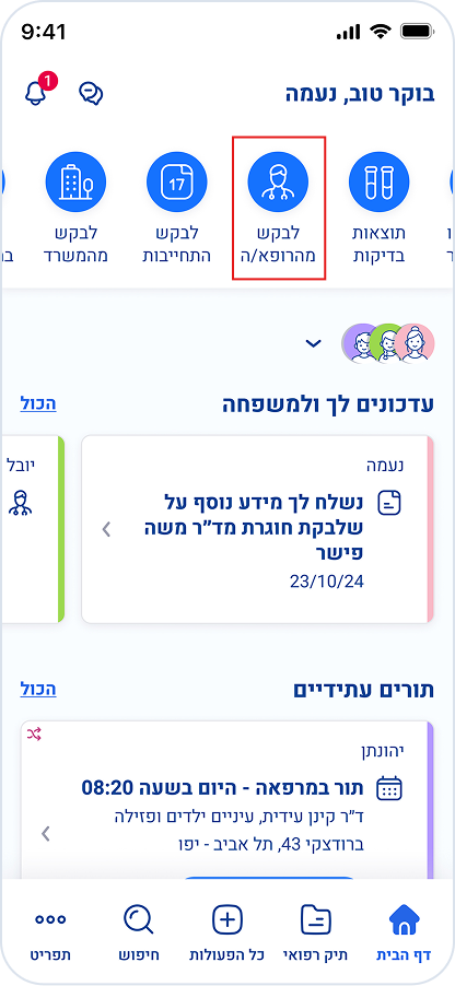 כדי לצפות בבקשות והודעות מרופאים, היכנסו לעמוד הבית, לתפריט שבתחתית המסך.