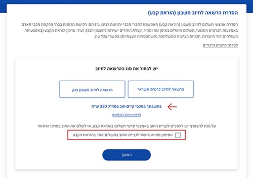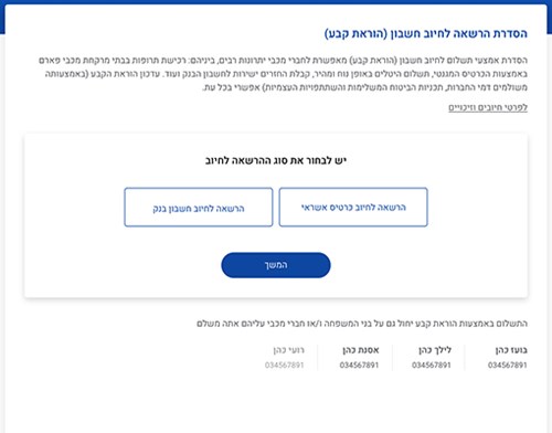 אפשר לבחור הרשאה לחיוב בכרטיס אשראי או לחיוב בחשבון הבנק.